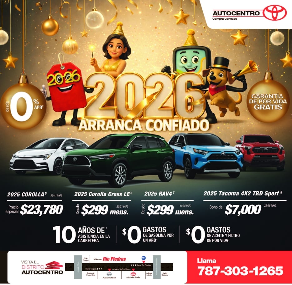 Los precios y pagos aquí reflejados no incluyen seguros, tablillas, ni ACAA. Licencia y gastos de registro varían. $0 deducible en hojalatería en estimados que sobrepasen los $2,500 por Smile Collision Center.Ninguna oferta puede ser combinada con otra. Ofertas sujetas a contrato de servicio. Todos los financiamientos y ofertas están sujetos a aprobación de crédito en adición a parámetros establecidos por la entidad de financiamiento. Ninguna oferta puede ser combinada con otras, ciertas restricciones aplican. Algunos modelos podrían no ser igual al ilustrado. Toda oferta mostrada y mencionada aquí son sujetas a aprobación de crédito. Unidades anunciadas son sujeto a disponibilidad de inventario. Ciertas restricciones aplican. Sujeto a aprobación de crédito. Ofertas válidas hasta el 31 enero de 2026 o mientras duren las unidades.